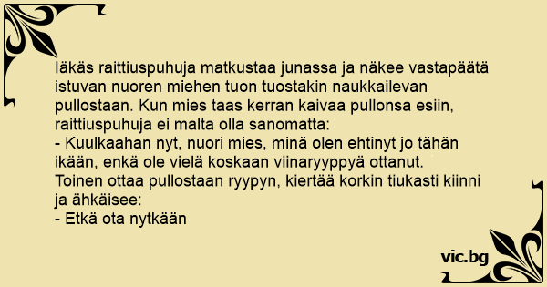 Iäkäs raittiuspuhuja matkustaa junassa ja näkee vastapäätä istuvan nuoren miehen tuon tuostakin naukkailevan pullostaan. Kun mies taas kerran kaivaa pullonsa esiin, raittiuspuhuja ei malta olla sanomatta: