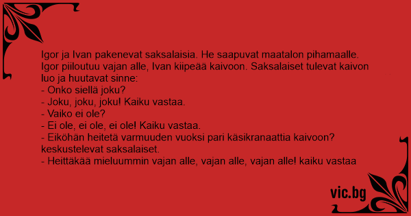 - Heittäkää mieluummin vajan alle, vajan alle, vajan alle! kaiku vastaa
