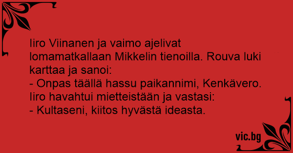 Iiro Viinanen ja vaimo ajelivat lomamatkallaan Mikkelin tienoilla. Rouva luki karttaa ja sanoi: