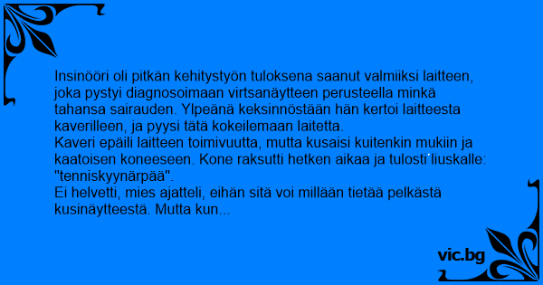 Insinööri oli pitkän kehitystyön tuloksena saanut valmiiksi laitteen, joka pystyi diagnosoimaan virtsanäytteen perusteella minkä tahansa sairauden. Ylpeänä keksinnöstään hän kertoi laitteesta kaverilleen, ja pyysi tätä kokeilemaan laitetta.