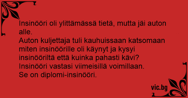 Auton kuljettaja tuli kauhuissaan katsomaan miten insinöörille oli käynyt ja kysyi insinööriltä että kuinka pahasti kävi?