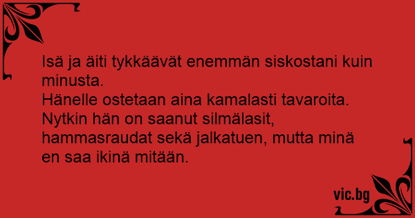 Isä ja äiti tykkäävät enemmän siskostani kuin minusta.