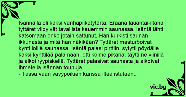 Isännällä oli kaksi vanhapiikatytärtä. Eräänä lauantai-iltana tyttäret viipyivät tavallista kauemmin saunassa. Isäntä lähti katsomaan onko jotain sattunut. Hän kurkisti saunan ikkunasta ja mitä hän näkikään? Tyttäret masturboivat kynttilöillä saunassa. Isäntä palasi pirttiin, sytytti pöydälle kaksi kynttilää palamaan, otti kolme pikaria, täytti ne viinillä ja alkoi ryypiskellä. Tyttäret palasivat saunasta ja alkoivat ihmetellä isännän touhuja.