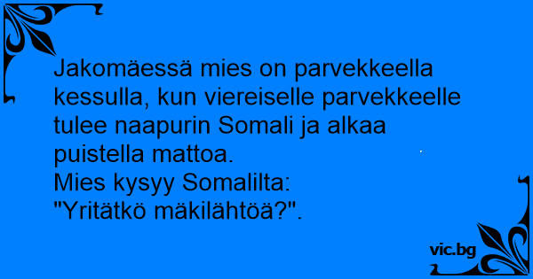 Jakomäessä mies on parvekkeella kessulla, kun viereiselle parvekkeelle tulee naapurin Somali ja alkaa puistella mattoa.