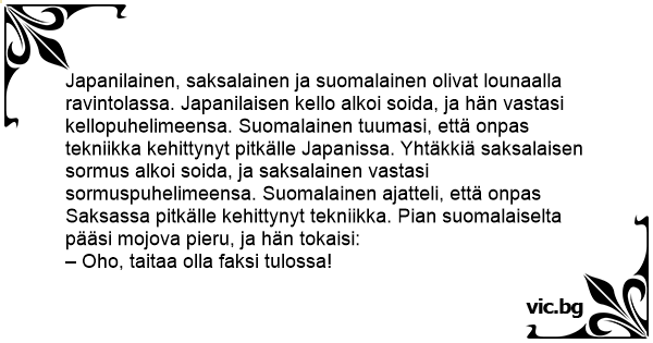 Suomalainen, sveitsiläinen ja japanilainen insinööri olivat kokoontuneet neuvotteluun. Yllättäen jostain kuului pirinää, sitten sveitsiläinen insinööri alkoi puhua rannekelloonsa. Hetken päästä...