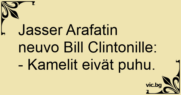 - Miksi te arabit viihdytte niin paljon lampaiden seurassa? Bill Clinton kysyi Jasser Arafatilta. - Lampaat eivät kirjoita muistelmia, Arafat hymyili.