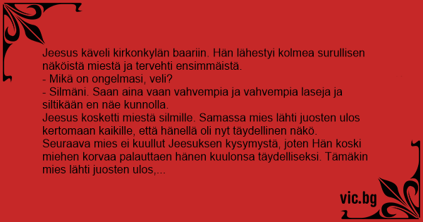 Jeesus käveli kirkonkylän baariin. Hän lähestyi kolmea surullisen näköistä miestä ja tervehti ensimmäistä.