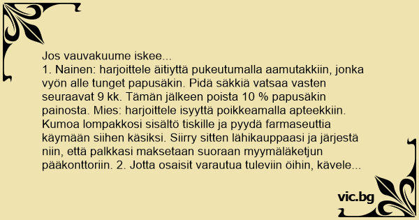 1. Nainen: harjoittele äitiyttä pukeutumalla aamutakkiin, jonka vyön alle tunget papusäkin. Pidä säkkiä vatsaa vasten seuraavat 9 kk. Tämän jälkeen poista 10 % papusäkin painosta. Mies: harjoittele isyyttä poikkeamalla apteekkiin. Kumoa lompakkosi sisältö tiskille ja pyydä farmaseuttia käymään siihen käsiksi. Siirry sitten lähikauppaasi ja järjestä niin, että palkkasi maksetaan suoraan myymäläketjun pääkonttoriin. 2. Jotta osaisit varautua tuleviin öihin, kävele ympäri huonetta kello 17.00-22.00 kantaen märkää kassia, jolla on painoa 3,5-5,5 kiloa. Iltakymmeneltä laita kassi pois, aseta herätyskello soimaan puoliltaöin ja mene nukkumaan. Herää kahdeltatoista ja kävele märän kassin kanssa ympäri olohuonetta yhteen saakka aamuyöllä. Laita herätyskello soimaan kolmelta. Koska et saa unta, nouse kahden aikoihin juomaan vettä. 15 minuuttia vaille kolme mene takaisin sänkyyn. Nouse ylös, kun kello pärähtää soimaan kolmelta. Lauleskele pimeässä neljään saakka. Laita herätyskello soimaan viideltä. Nouse ylös. Tee aamiaista. Jatka samaa rataa seuraavat 5 vuotta. Näytä iloiselta.