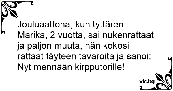 Jouluaattona, kun tyttären Marika, 2 vuotta, sai nukenrattaat ja paljon muuta, hän kokosi rattaat täyteen tavaroita ja sanoi: