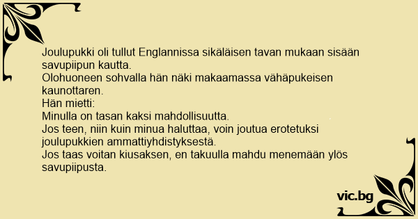 Jos taas voitan kiusaksen, en takuulla mahdu menemään ylös savupiipusta.