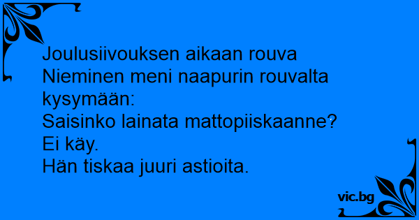 Joulusiivouksen aikaan rouva Nieminen meni naapurin rouvalta kysymään: