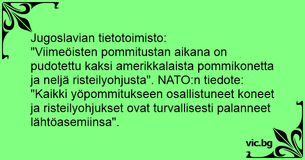 "Viimeöisten pommitustan aikana on pudotettu kaksi amerikkalaista pommikonetta ja neljä risteilyohjusta". NATO:n tiedote: