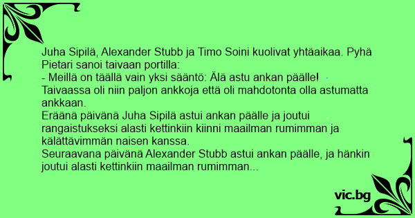 Juha Sipilä, Alexander Stubb ja Timo Soini kuolivat yhtäaikaa. Pyhä Pietari sanoi taivaan portilla: