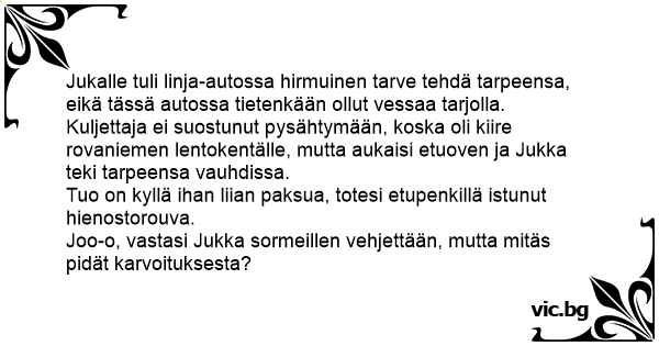 Jukalle tuli linja-autossa hirmuinen tarve tehdä tarpeensa, eikä tässä autossa tietenkään ollut vessaa tarjolla.