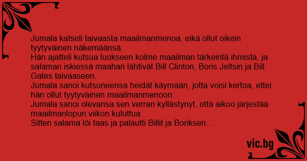 Hän ajatteli kutsua luokseen kolme maailman tärkeintä ihmistä, ja salaman iskiessä maahan lähtivät Bill Clinton, Boris Jeltsin ja Bill Gates taivaaseen.