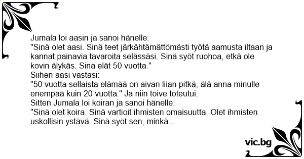 "Herra, olla mies vain 20 vuotta on liian vähän. Ole hyvä, ja anna minulle ne 30 vuotta, mitkä aasi jätti, ne 15 vuotta koiralta ja ne 10 vuotta apinalta."