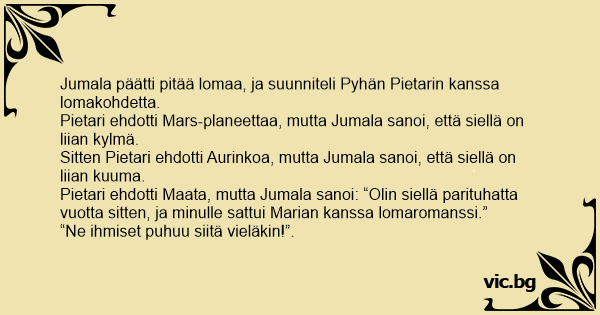 Jumala oli lähdössä lomalle. Yhdessä Pyhän Pietarin kanssa he suunnittelivat, mikä olisi sopiva lomakohde. Pietari ehdotti Marsia. - Siellä on liian kylmä, Jumala sanoi, eikä innostunut Marsin...