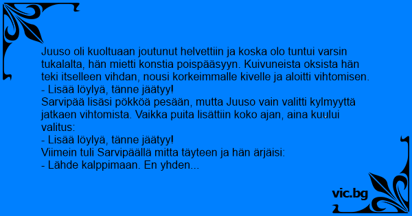 Juuso oli kuoltuaan joutunut helvettiin ja koska olo tuntui varsin tukalalta, hän mietti konstia poispääsyyn. Kuivuneista oksista hän teki itselleen vihdan, nousi korkeimmalle kivelle ja aloitti vihtomisen.