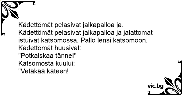 Kädettömät pelasivat jalkapalloa ja jalattomat istuivat katsomossa. Pallo lensi katsomoon.