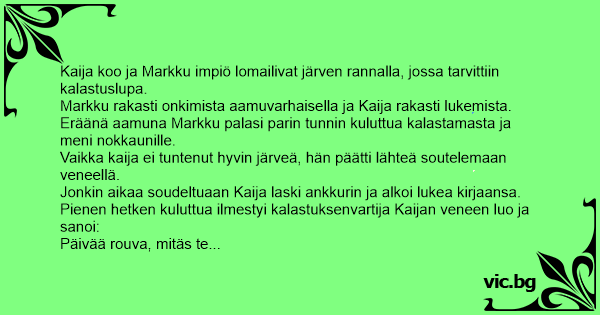 Kaija koo ja Markku impiö lomailivat järven rannalla, jossa tarvittiin kalastuslupa.
