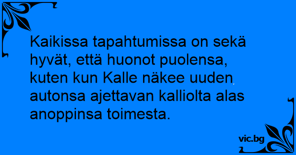 Kaikissa tapahtumissa on sekä hyvät, että huonot puolensa, kuten kun Kalle näkee uuden autonsa ajettavan kalliolta alas anoppinsa toimesta.