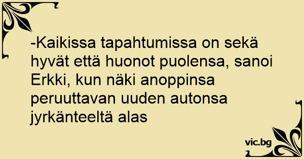 -Kaikissa tapahtumissa on sekä hyvät että huonot puolensa, sanoi Erkki, kun näki anoppinsa peruuttavan uuden autonsa jyrkänteeltä alas