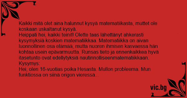 Heippati hei, kaikki teinit! Olette taas lähettänyt ahkerasti kysymyksiä koskien matematiikkaa. Matematiikka on aivan luonnollinen osa elämää, mutta nuoren ihmisen kasvaessa hän kohtaa usein epävarmuutta. Runsas tieto ja ennenkaikkea hyvä itasetunto ovat edellytyksiä nautinnolliseenmatematiikkaan.