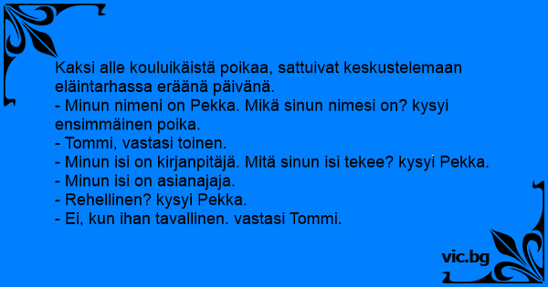 - Minun nimeni on Pekka. Mikä sinun nimesi on? kysyi ensimmäinen poika.