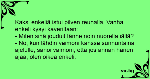 Kaksi enkeliä istui pilven reunalla. Vanha enkeli kysyi kaveriltaan: