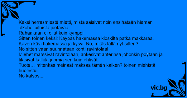 Kaksi herrasmiestä mietti, mistä saisivat noin ensihätään hieman alkoholipitoista juotavaa.