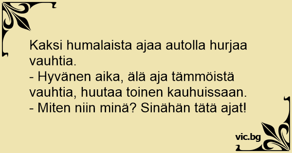 - Hyvänen aika, älä aja tämmöistä vauhtia, huutaa toinen kauhuissaan.