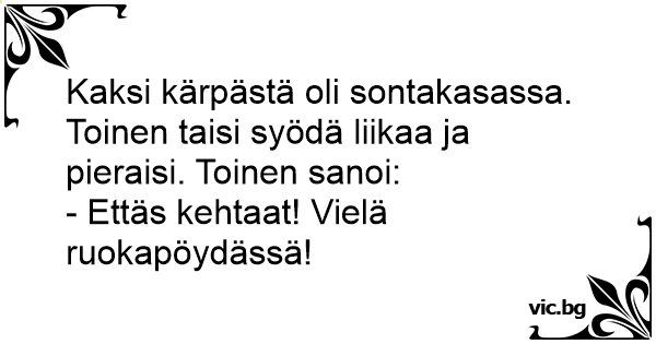 Kaksi kärpästä oli sontakasassa. Toinen taisi syödä liikaa ja pieraisi. Toinen sanoi:
