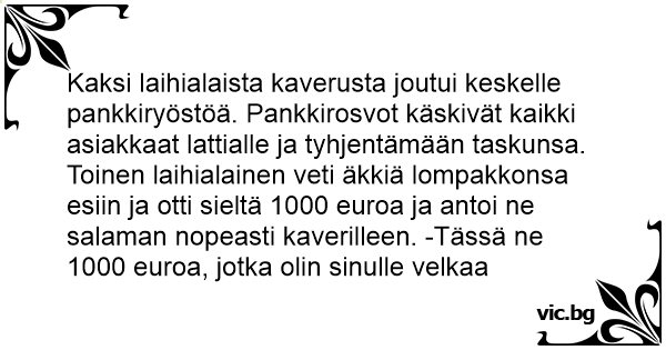 Kaksi laihialaista kaverusta joutui keskelle pankkiryöstöä. Pankkirosvot käskivät kaikki asiakkaat lattialle ja tyhjentämään taskunsa. Toinen laihialainen veti äkkiä lompakkonsa esiin ja otti sieltä 1000 euroa ja antoi ne salaman nopeasti kaverilleen. -Tässä ne 1000 euroa, jotka olin sinulle velkaa