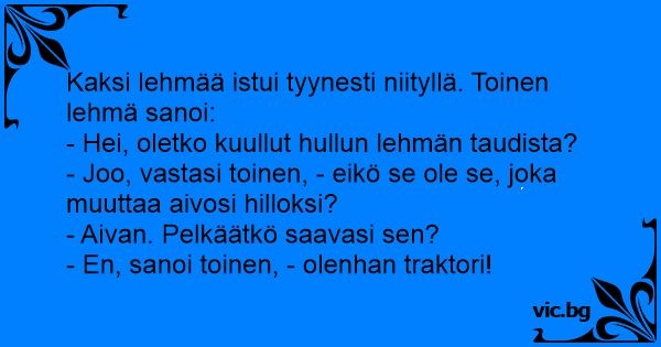 Kaksi lehmää istui tyynesti niityllä. Toinen lehmä sanoi: