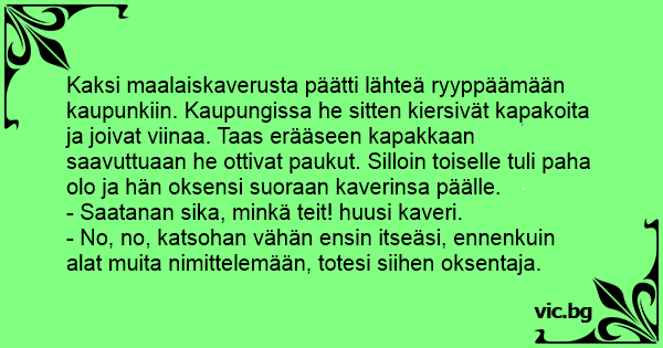 Kaksi maalaiskaverusta päätti lähteä ryyppäämään kaupunkiin. Kaupungissa he sitten kiersivät kapakoita ja joivat viinaa. Taas erääseen kapakkaan saavuttuaan he ottivat paukut. Silloin toiselle tuli paha olo ja hän oksensi suoraan kaverinsa päälle.