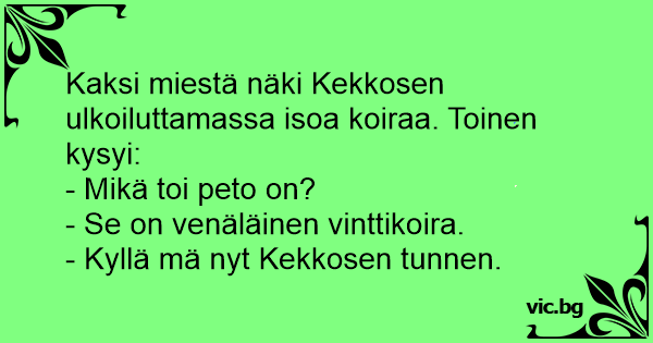 Kaksi miestä näki Kekkosen ulkoiluttamassa isoa koiraa. Toinen kysyi: