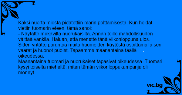 Maanantaina tuomari ja nuorukaiset tapasivat oikeudessa. Tuomari kysyi toiselta mieheltä, miten tämän viikonloppukampanja oli mennyt. Poika vastasi: