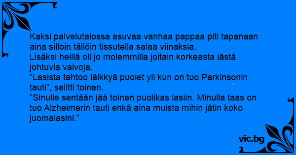 ”Sinulle sentään jää toinen puolikas lasiin. Minulla taas on tuo Alzheimerin tauti enkä aina muista mihin jätin koko juomalasini.”