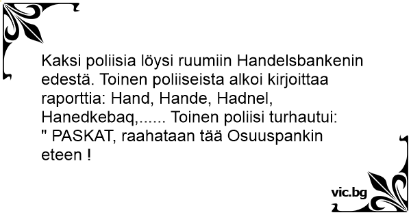 Kaksi poliisia löysi ruumiin Handelsbankenin edestä. Toinen poliiseista alkoi kirjoittaa raporttia: Hand, Hande, Hadnel, Hanedkebaq,...... Toinen poliisi turhautui: