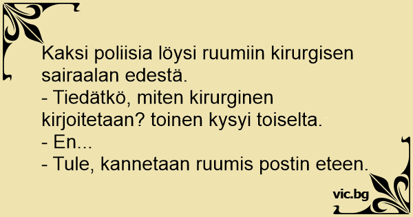 - Tiedätkö, miten kirurginen kirjoitetaan? toinen kysyi toiselta.