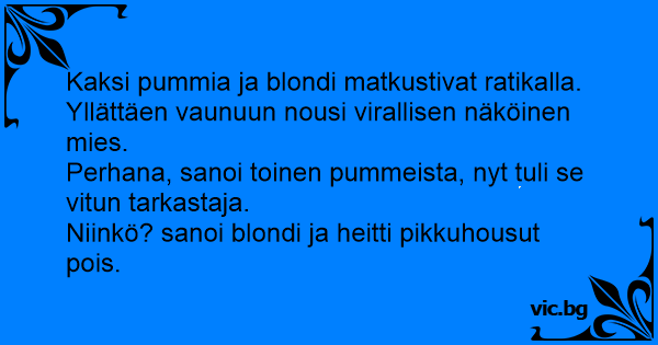 Kaksi pummia ja blondi matkustivat ratikalla. Yllättäen vaunuun nousi virallisen näköinen mies. Perhana, sanoi toinen pummeista, nyt tuli se vitun tarkastaja. Niinkö? sanoi blondi ja heitti pikkuhousut pois.