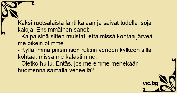 Kaksi ruotsalaista lähti kalaan ja saivat todella isoja kaloja. Ensimmäinen sanoi: