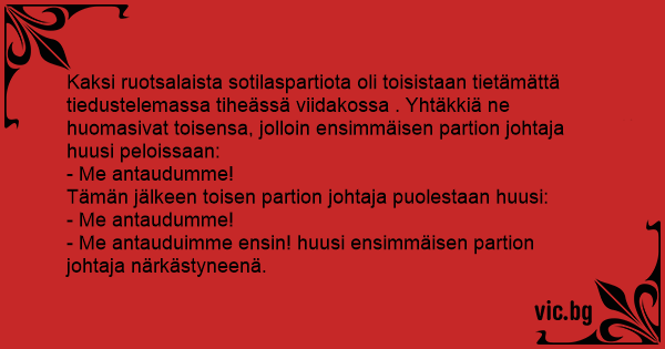 Kaksi ruotsalaista sotilaspartiota oli toisistaan tietämättä tiedustelemassa tiheässä viidakossa . Yhtäkkiä ne huomasivat toisensa, jolloin ensimmäisen partion johtaja huusi peloissaan: