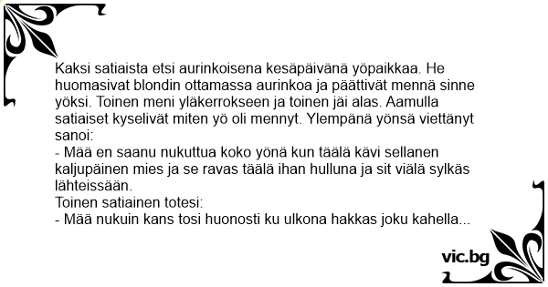 Kaksi satiaista etsi aurinkoisena kesäpäivänä yöpaikkaa. He huomasivat blondin ottamassa aurinkoa ja päättivät mennä sinne yöksi. Toinen meni yläkerrokseen ja toinen jäi alas. Aamulla satiaiset kyselivät miten yö oli mennyt. Ylempänä yönsä viettänyt sanoi: