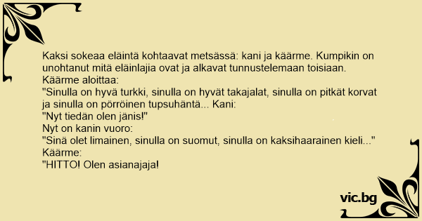 "Sinulla on hyvä turkki, sinulla on hyvät takajalat, sinulla on pitkät korvat ja sinulla on pörröinen tupsuhäntä... Kani: