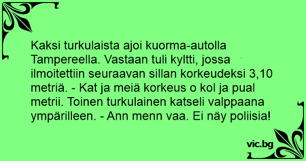 Kaksi turkulaista ajoi kuorma-autolla Tampereella. Vastaan tuli kyltti, jossa ilmoitettiin seuraavan sillan korkeudeksi 3,10 metriä. - Kat ja meiä korkeus o kol ja pual metrii. Toinen turkulainen katseli valppaana ympärilleen. - Ann menn vaa. Ei näy poliisia!