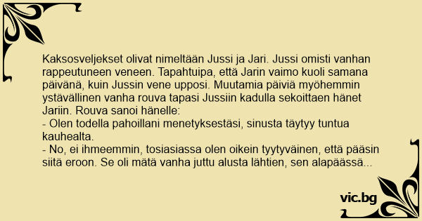 Kaksosveljekset olivat nimeltään Jussi ja Jari. Jussi omisti vanhan rappeutuneen veneen. Tapahtuipa, että Jarin vaimo kuoli samana päivänä, kuin Jussin vene upposi. Muutamia päiviä myöhemmin ystävällinen vanha rouva tapasi Jussiin kadulla sekoittaen hänet Jariin. Rouva sanoi hänelle: