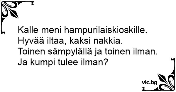 Kalle meni hampurilaiskioskille.<br />Hyvää iltaa, kaksi nakkia.<br />Toinen sämpylällä ja toinen ilman.<br />Ja kumpi tulee ilman?