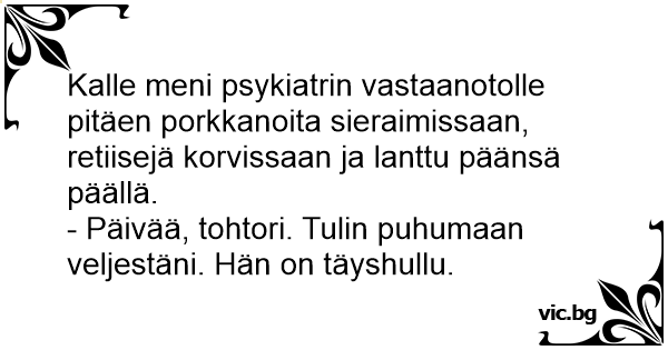 Kalle meni psykiatrin vastaanotolle pitäen porkkanoita sieraimissaan, retiisejä korvissaan ja lanttu päänsä päällä.