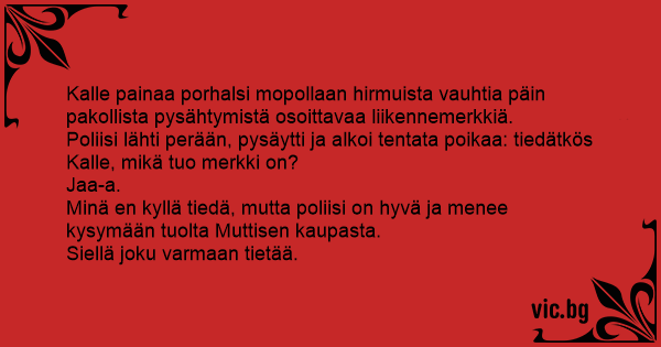 Poliisi lähti perään, pysäytti ja alkoi tentata poikaa: tiedätkös Kalle, mikä tuo merkki on?